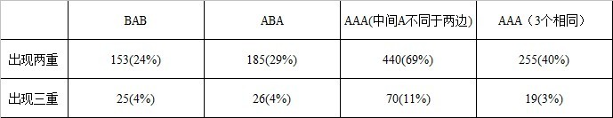 一共测试638次,上面给出了出现两重和三重的概率。发现当出现初始位置为AAA(中间A不同于两边A时),拉杆出现2重以上的几率高达80%!