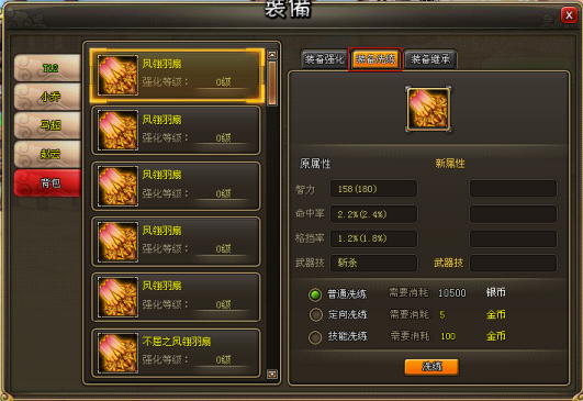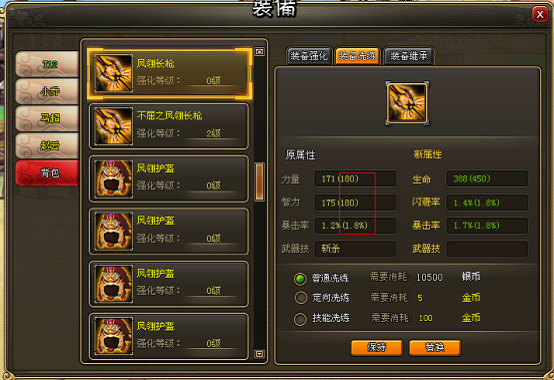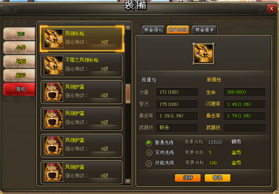 绿色以上品质的装备都会有附加属性,洗炼可以改变装备附加属性的类型和增加的数值。