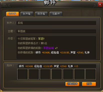 军团战结束后系统会自动发送一封邮件给参加过军团战的玩家,参与军团战会奖励大量的银币、经验、声望、礼券。