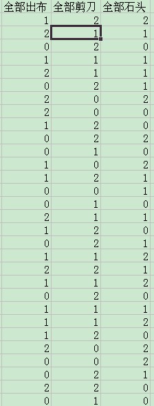 300次猜拳,前100次全部是布,后100次全部出剪刀,再后100次全部出石头。(1为赢,2为输,0为平)
