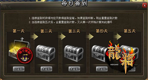 俗话说“天上不会有掉馅饼的好事”,可是在陪游龙将天天都会有这种好事。你可别小看了每日签到的宝箱哦!说不定它可以在你最急需的时候助你一臂之力了。每天玩家只要登录陪游龙将签到一次就有好礼相送。如果玩家能坚持连续签到的话,就可获得对应天数的签到宝箱,签到中断则重置签到次数。另外当玩家们连续签到五次后,也会重置签到次数,又从第一次开始计算。