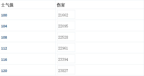 做成图会发现:士气的增加与技能伤害呈直线关系,每增加一点士气,技能伤害增加108.25,相当于普通技能伤害的108.25/21662=0.05,即每增加1点士气会增加5%的技能伤害。